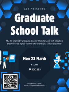 Join Manchester University’s chapter of the American Chemical Society in their graduate school event. This event will feature alumnus Connor Hamilton ’25 and he will speak about this journey to graduate school! The talk will be held in room 203 in the Science Center.