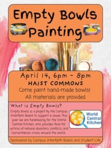Join us on April 14th in Haist Commons from 6 to 8 p.m. to paint bowls for the Empty Bowls fundraiser! Empty Bowls is a joint effort between the Campus Interfaith Board and Student life to raise funds for World Central Kitchen. World Central Kitchen provides food for victims of natural disaster, conflicts, and humanitarian crises around the world.