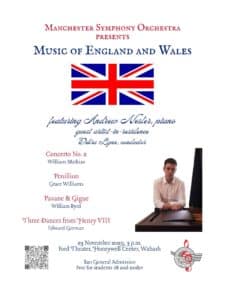 The Manchester Symphony Orchestra presents Music of England and Wales, featuring guest artist-in-residence Andrew Nesler, performing William Mathias’ Piano Concerto No. 2. Nesler has performed throughout the United States, Canada, England, Wales, Germany, Czechia, and Austria. Specializing in post-World War II music, he earned a Master of Music degree from the Royal Welsh College of Music and Drama, where he developed a particular interest in Welsh piano music. Dr. Debra Lynn will conduct the performance, which will also include Three Dances from Henry VIII by Edward German, Pavane and Gigue by William Byrd, and Penillion by Grace Williams. Tickets are $20, but MU students get in for free.