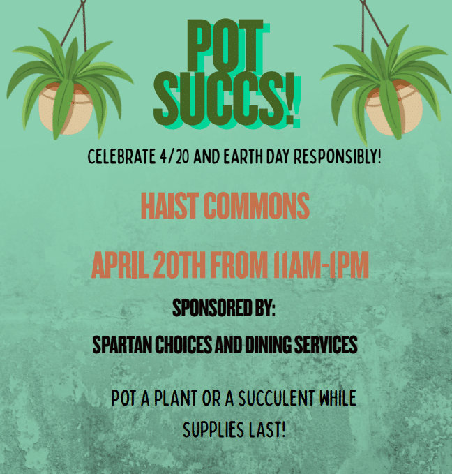 Join Spartan Choices and Dining Services in their “Pot Succs” event! Come to Haist Commons from 11 am to 1 pm to pot a plant or succulent while supplies last.