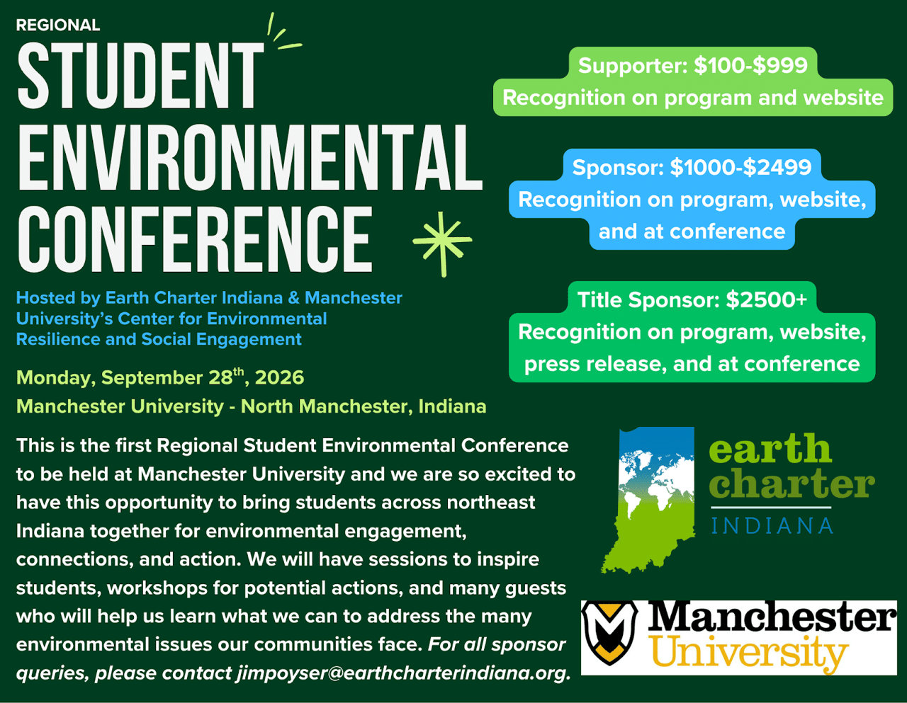 We are excited to announce the first Regional Student Environmental Conference hosted by Manchester University’s Center for Environmental Resilience and Social Engagement and Earth Charter Indiana.