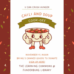 U Can Crush Hunger Chili and Soup Cook-OffJoin us to support U Can Crush Hunger! Bring 5 canned goods to donate. Sign up your entry! Date: November 4, 2025Time: 12:00 pm - 1:30 pmVenue: Funderberg LibraryAdd To CalendarGoogle CalendarApple CalendarExport .ics fileOutlook LiveOutlook 360